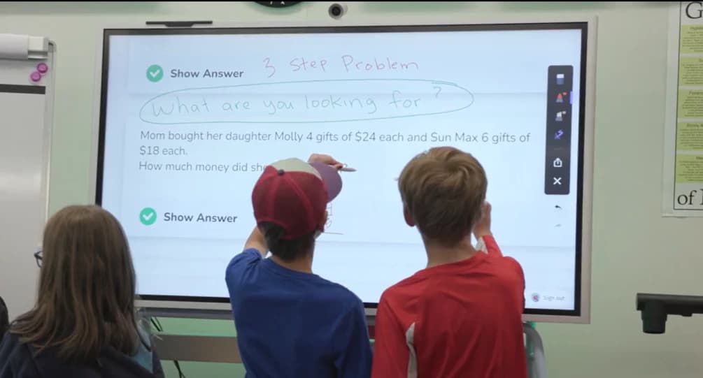 In middle school math, the digital whiteboard changes the dynamic of problem-solving from individual seatwork to collective reasoning. A teacher presents a multi-step problem. Rather than calling on one student, she divides the board into sections and assigns small groups to each section simultaneously — using the whiteboard's multi-user annotation feature.
