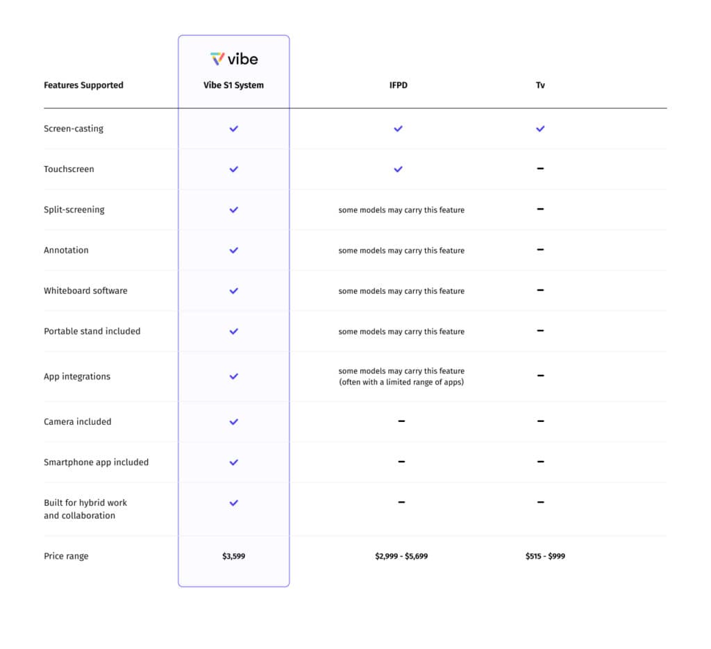 Vibe’s S1 system is all-in-one, making the user experience as simple as possible. The tools used in the system are all native to one another, and work together fabulously. Compare the cost of Vibe’s S1 system to traditional conference room tools here.