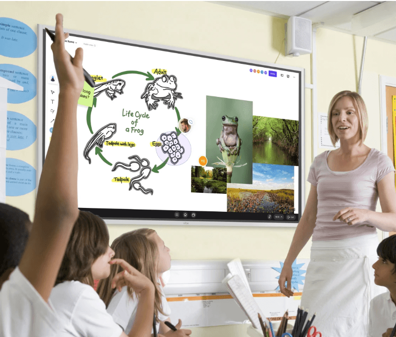 For a typical classroom of 25–35 students, a 75″ or 86″ interactive screen for classroom use provides adequate visibility from all seating positions at standard row depths (up to approximately 25–30 feet). Smaller classrooms (under 20 students) can function well with a 65″ board. For spaces larger than 35 students or with long seating depths, a second display or a large-format projector may supplement the board. The Vibe Board includes a classroom sizing guide based on seating configurations.