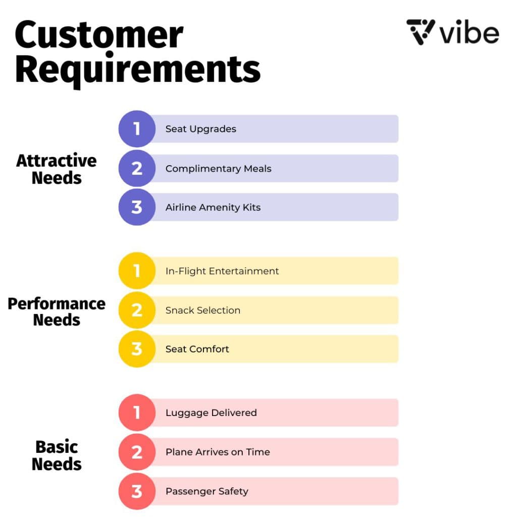 Create a list of customer demands to test, taking into account suggestions from the design team and existing customers. Let’s use the case of an airline looking to improve customer satisfaction.