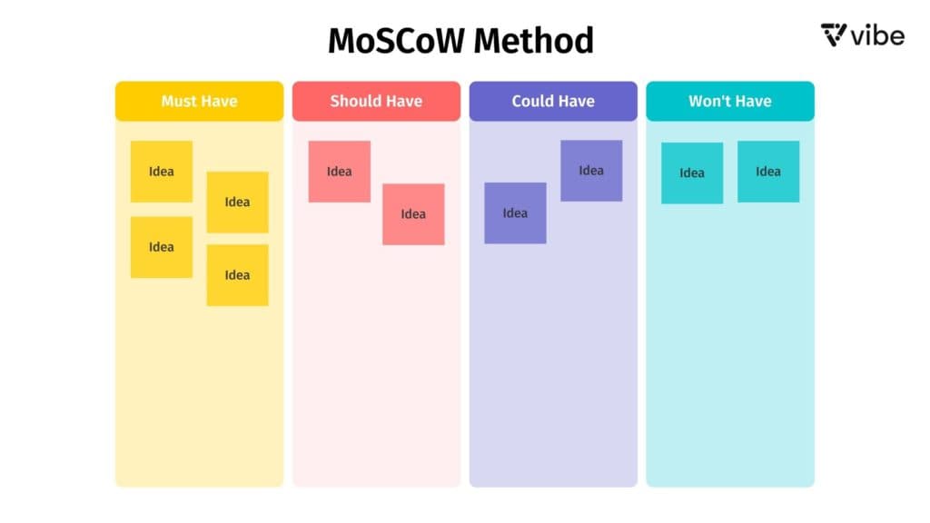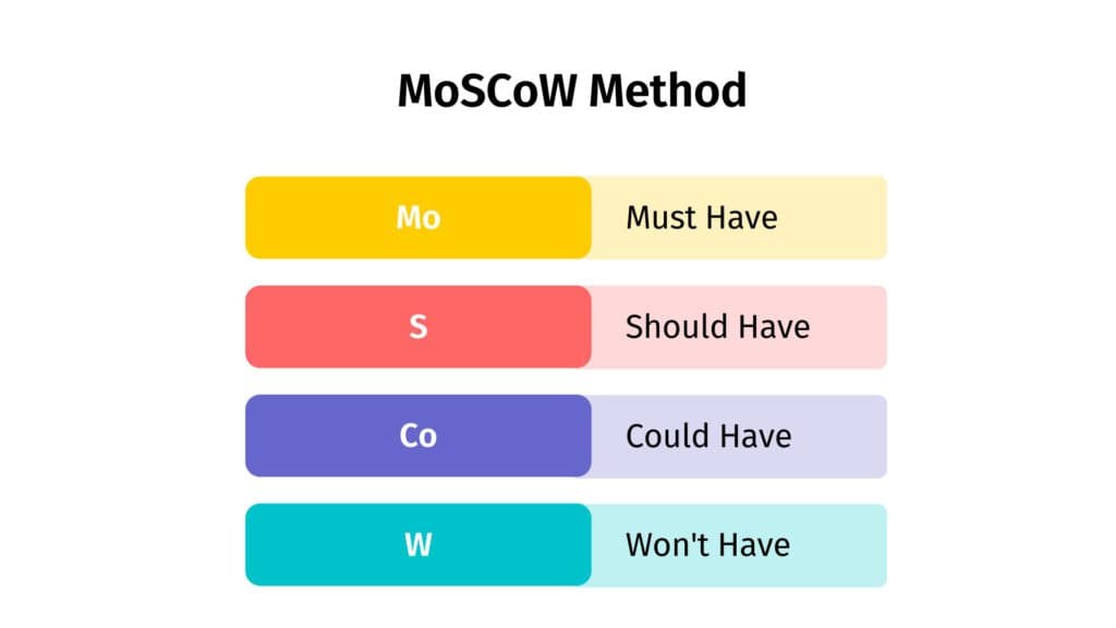 There are four categories in the Moscow Method. These are Must-Haves, Should-Haves, Could-Haves, and Won’t-Haves.