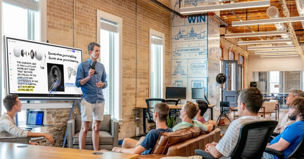 Along with collaborating in real-time, this smart whiteboard allows users to collaborate across devices in real-time, so you can keep projects on track and discuss methodologies and strategies, whether your team is in the same room or working across the globe.