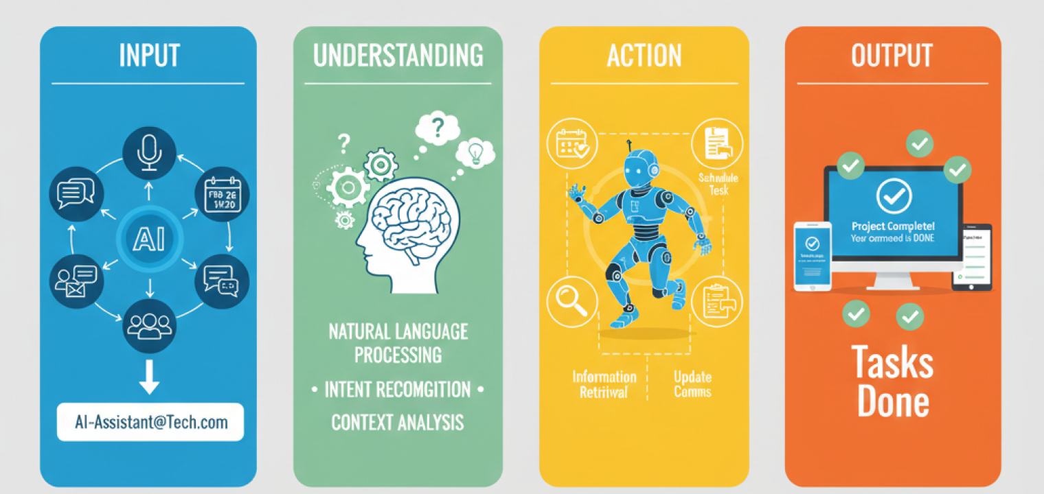 AI assistants work through a simple loop: you make a request, the assistant understands what you mean, takes action, and delivers a result. That request can come from typed text, a voice command, or even a conversation captured during a meeting. Behind the scenes, the assistant uses language understanding and learning models to figure out intent, context, and next steps. The idea is that you don’t have to spell everything out.