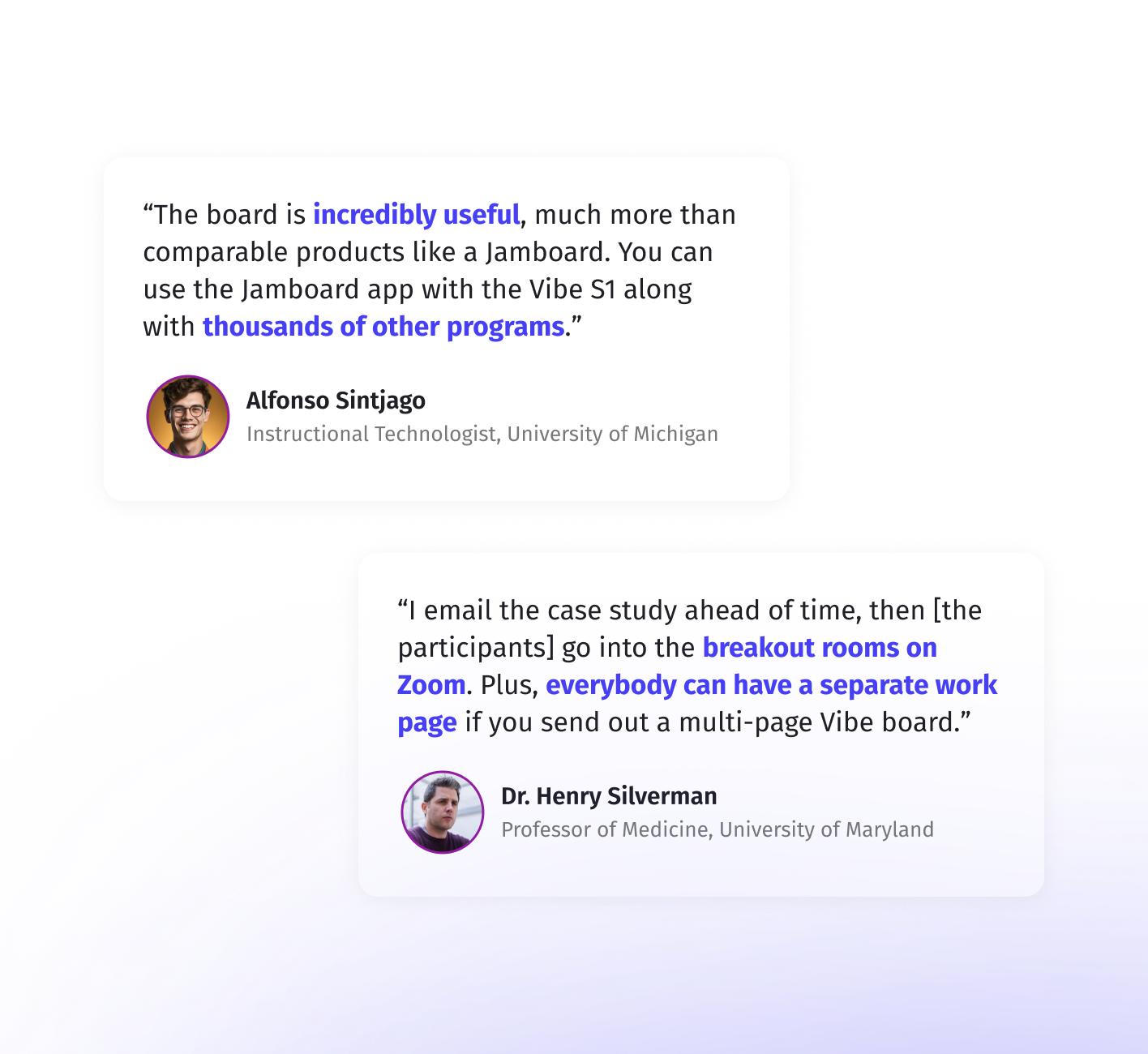 “The Vibe board gets all the big ideas out of my head and into the world for my team to see and take action on. I use it for training the team, brainstorming, and keeping track of everyone’s key projects. I enjoying using the Vibe board and look forward to the days I spend working on it.”