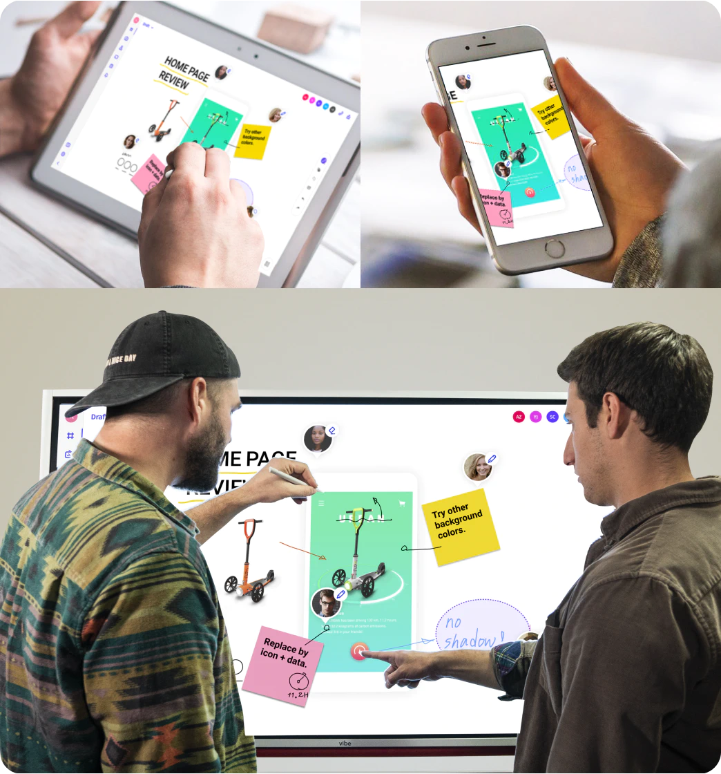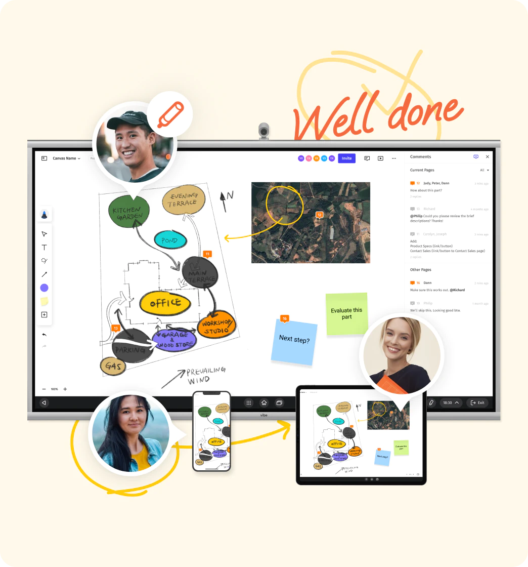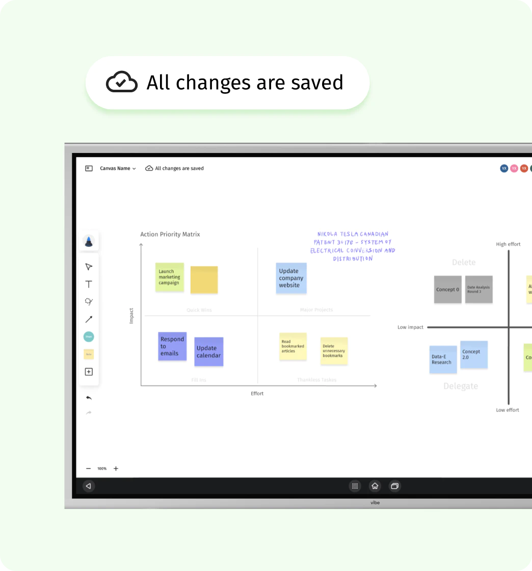 Collaborate in real-time on the same infinite canvas—from a Vibe Board, web browser, or tablet. Canvas auto-saves all discussions to the cloud in real-time, eliminating the fear of losing important ideas.