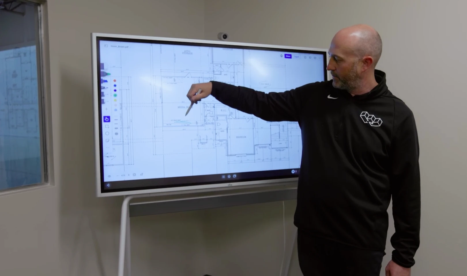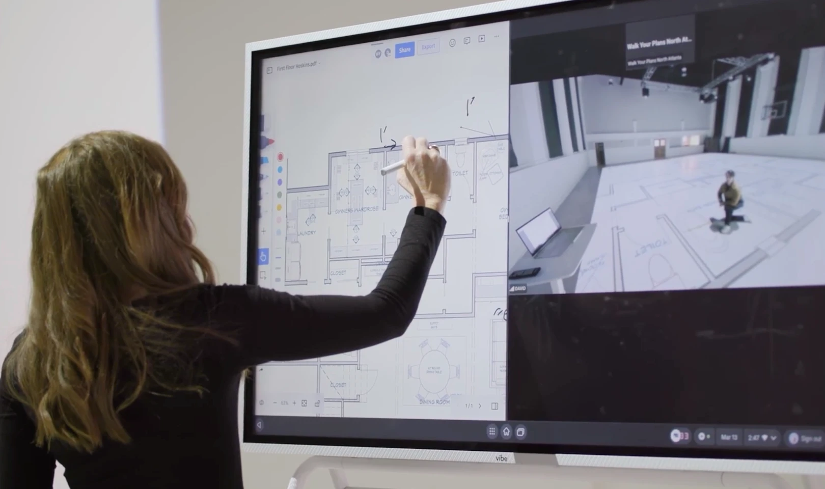 Mary and her team usually preload client floor plans into Vibe Canvas, enabling real-time markup when clients arrive. During sessions, clients actively alternate between walking through plans in the showroom and digitally annotating on the board. They can zoom in and out on room details, draw markup lines with styluses in various thicknesses and colors to highlight potential changes. Or they could directly add notes and stickers on the responsive interface, and walk back to where they left in the showroom.