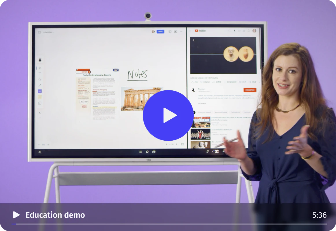 To provide the best video conferencing experience, Vibe S1 offers an optional SmartCam C1, which comes equipped with image enhancement, noise cancellation, and AI features such as auto framing, gallery mode, and more. Vibe is also compatible with most USB-connected cameras and microphones, such as Logitech BRIO, Polycom Studio, etc.
