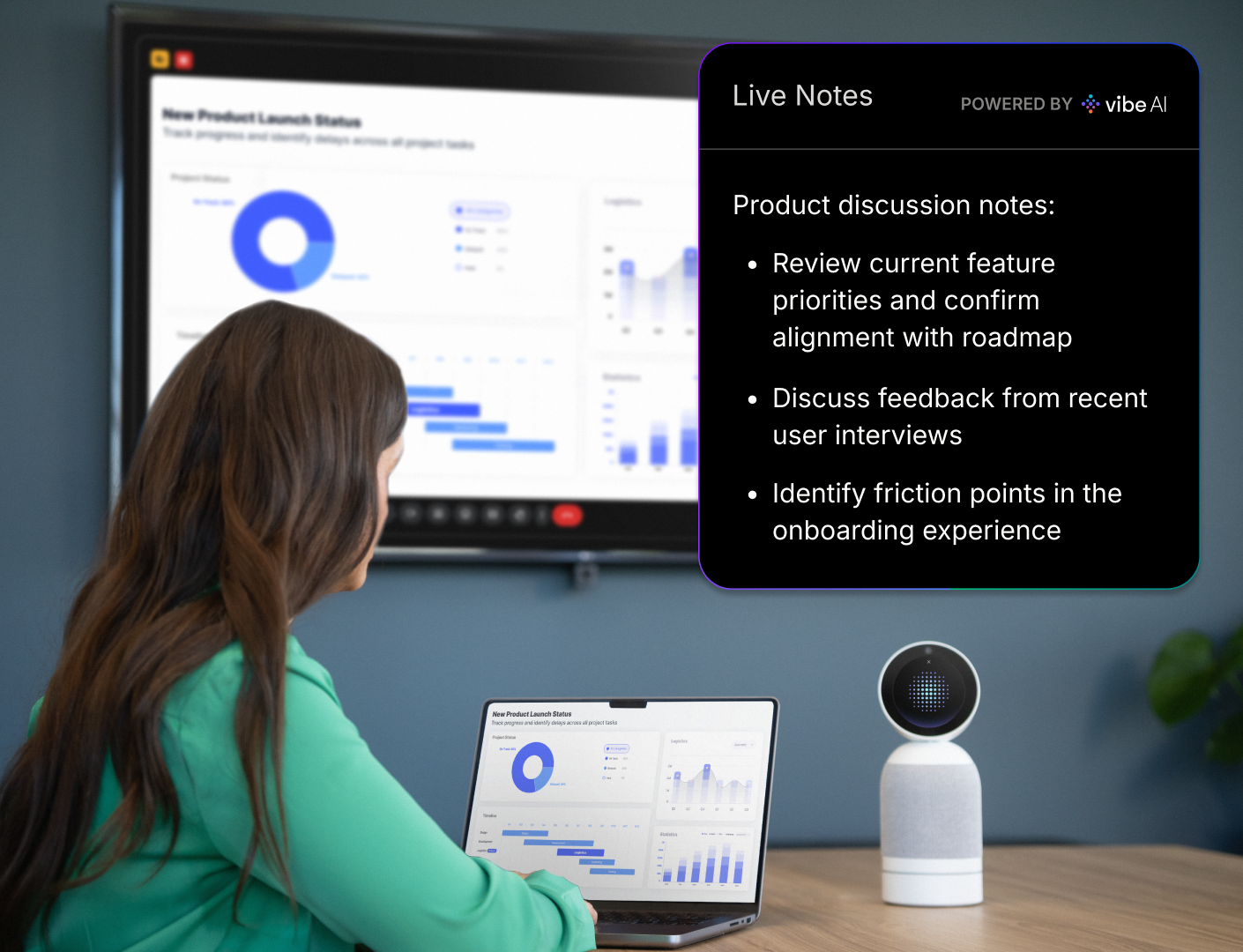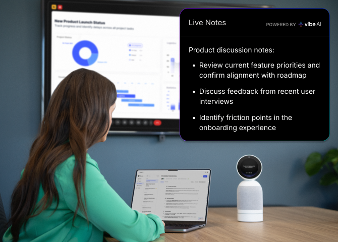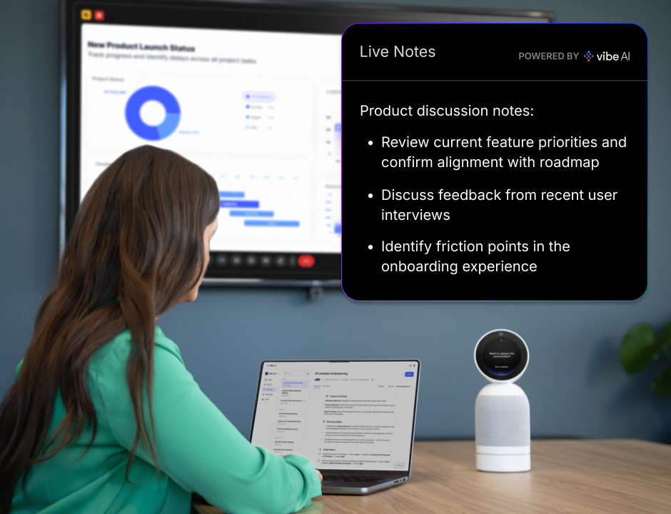 Join meetings in person or remotely while Vibe Bot captures what’s said and preserves the full context behind decisions.