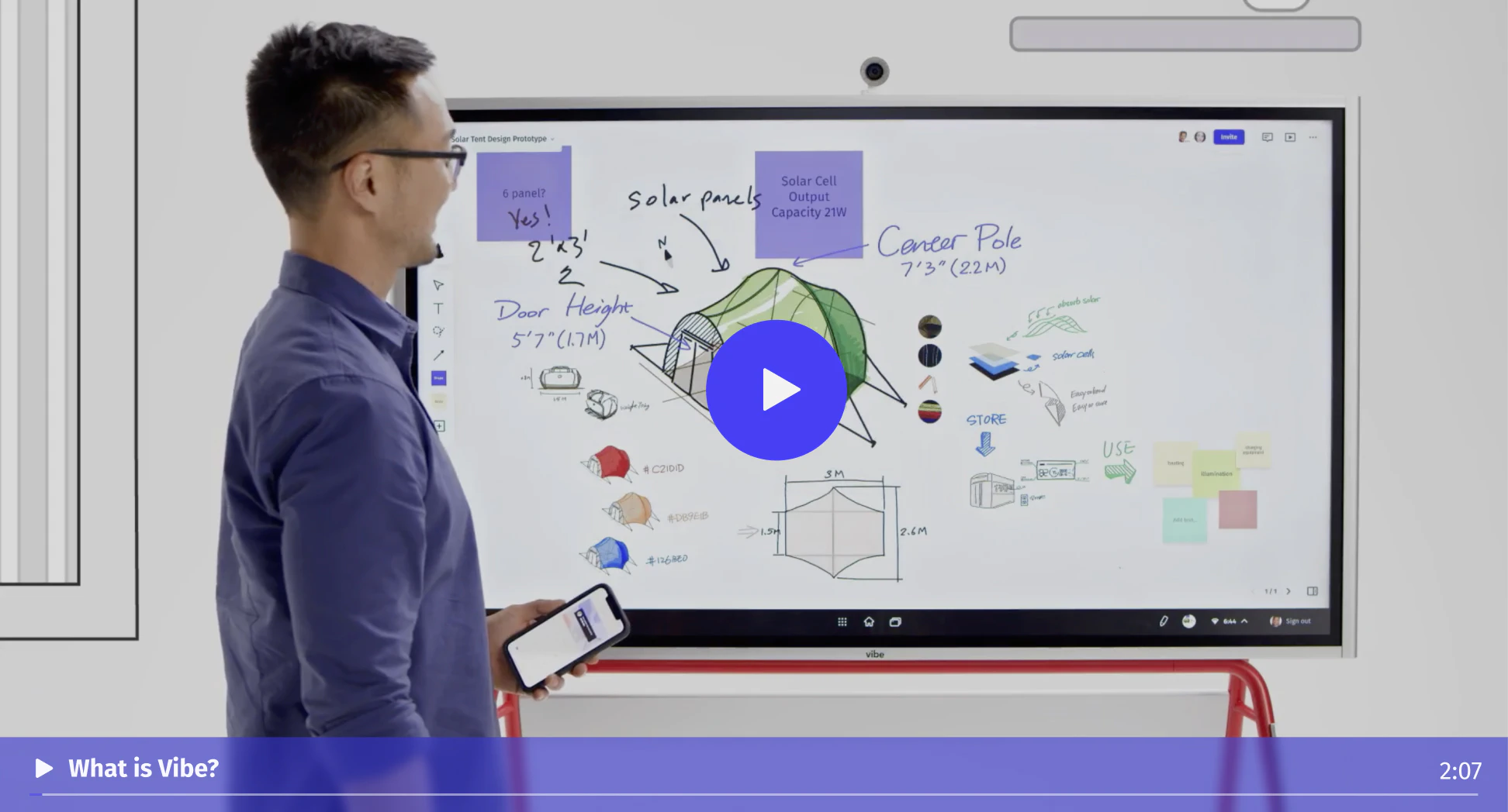 Vibe Board S1 has two built-in speakers, but no built-in microphone. The (optional) SmartCam C1 was designed for Vibe S1, and comes equipped with 6 omni-directional microphones, as well as noise and echo cancellation. Vibe Boards are also compatible with most USB-connected cameras and microphones, such as Logitech BRIO, Owl Camera, Polycom Studio, and more.