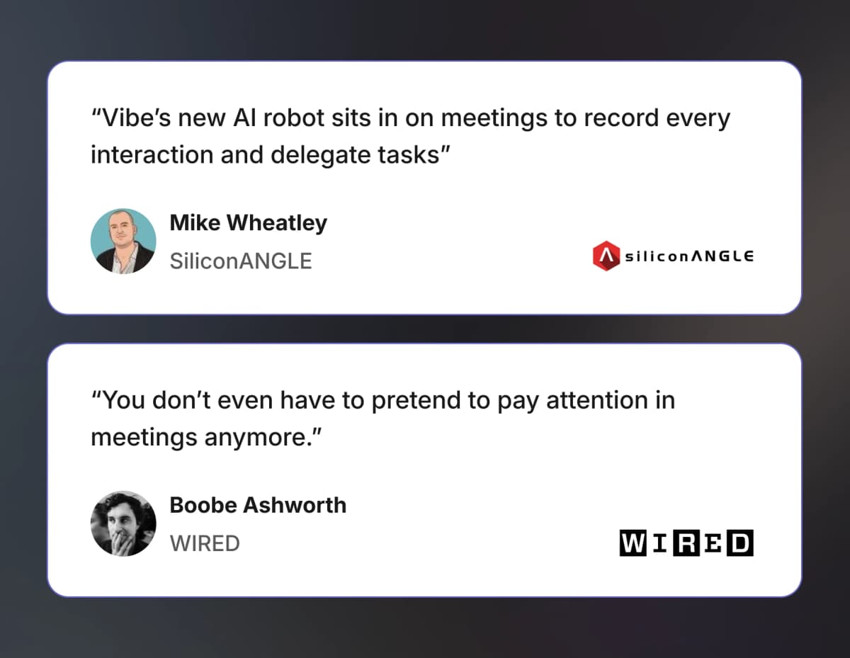 Get briefings, extract action items, and even let Vibe Bot execute tasks for you.Get briefings, extract action items, and even let Vibe Bot execute tasks for you.