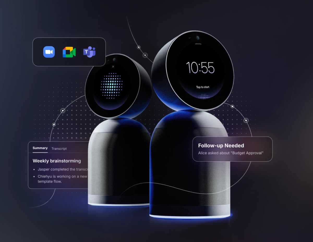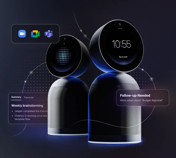 Vibe Bot has a 4K camera to track attendees and can also act like a webcam. It has beamforming microphones to take meeting notes.