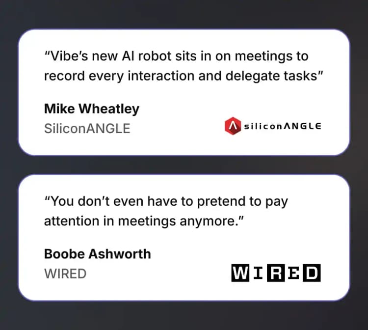 • Media Coverage: Logos and references to third-party publications are used solely for informational purposes to indicate editorial media coverage and remain the intellectual property of their respective publishers. Their use does not constitute an official partnership, sponsorship, or endorsement of Vibe or its products by these publications. References include: The Verge, SiliconANGLE, Wired, TechCrunch, Forbes: The Forbes logo and the "America's Best Startup Employers" designation are trademarks of Forbes Media LLC and are used for informational purposes based on Forbes' independent editorial list and methodology.